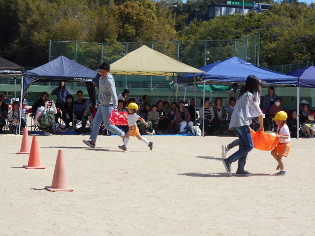 親子リレー。短い距離でも、大人にとっては大切な準備体操の時間です。