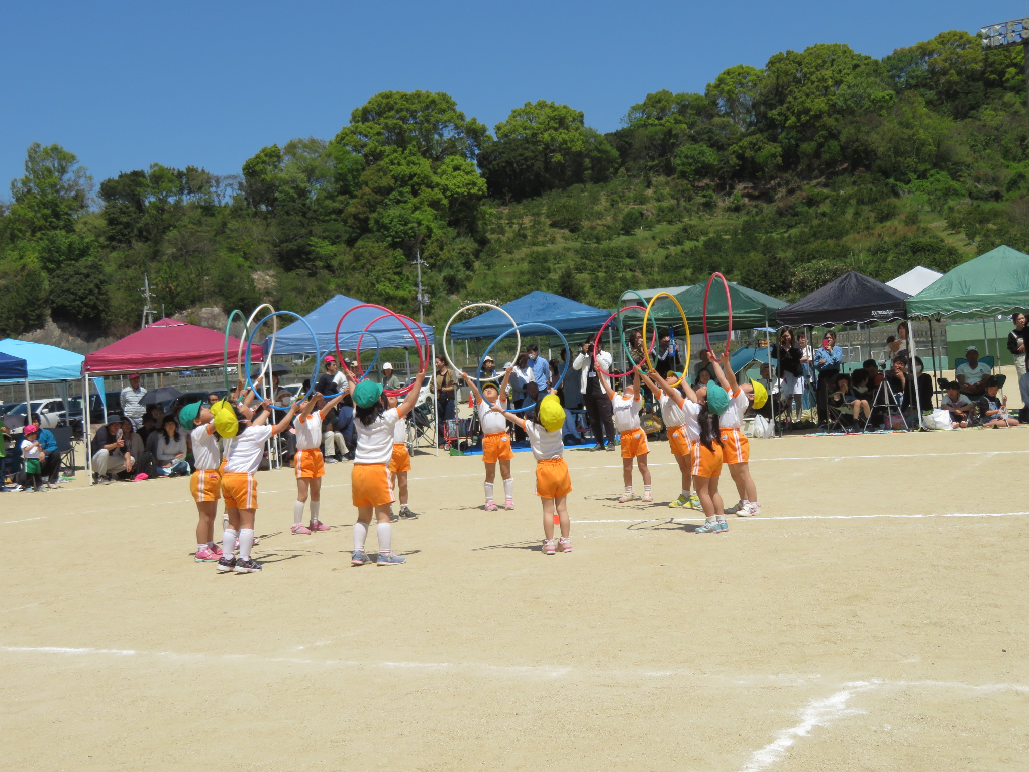 年中組のフープ体操。USAの曲に合わせてかっこよく踊りきりました。